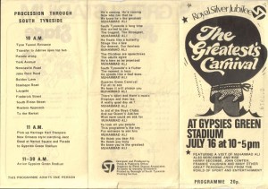 There was even a song written specially for the visit: “He’s coming, he’s coming, now who can that be,we know he’s the greatest, Muhammad Ali.” “South Tyneside has waited a long time to see, the biggest, the strongest, Muhammad Ali.” “He floats like a butterfly, stings like a bee, our dearest, our fearless, Muhammad Ali.” “The children are speechless, the adults aglee, he came as he promised, Muhammad Ali.” “South Tyneside’s aflutter, the moment is here, he stands like a god does, Muhammad Ali.” “Gypsies Green Carnival, for all to see, we hope it will please you, Muhammad Ali.” “There’s sport and there’s music, displays and then tea, a really good day oh!; Muhammad Ali.” “In aid of our Boys Clubs, and our Queen’s Jubilee, what more could we ask for, Muhammad Ali.” “So look all you people, this programme’s the key, for entrance to see him, Muhammad Ali.” “We thank you dear Ali, we thank you truly, we know you’re the greatest, Muhammad Ali.” Great memories