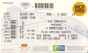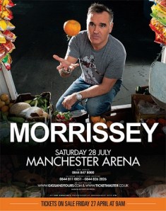 Welcome home Morrissey! Laura and I went to see the great man perform at the vast Manchester Arena last night. We arrived early, had a look at the merchandise, but decided to pass as Laura was looking for any Morrissey vinyl. We also noticed that all the fast food stalls were selling veggie. Morrissey had obviously insisted that no burgers were to be sold. Support came from Kristeen Young, who has opened for Mozza for some time now. Her weird screechy music bemused the audience as it usually does. During the interval the customary video show displayed some choice obscure cuts, several of which we had seen before, and a couple that were new to us. I recognised Shocking Blue, Vince Taylor (who Morrissey must have modelled himself on to some extent), New York Dolls, Bridget Bardot, and a great video of Francoise Hardy travelling through the night lights of a city (London and Soho?) in an open top car singing “All Over the World”; just perfect. And then a taped rant of some of the world’s ills is played across the PA (Adolf Hitler, torture, Nelson Mandella’s imprisonment, cancer, etc, you get the idea) which must have gone on 5 minutes or more, and Morrissey’s onstage early at 8.35pm. The early entrance took the crowd by surprise, and many people were still entering the arena at that point. The screen shows a cheesy picture of Adam West and Burt Ward (60s Batman and Robin). Morrissey was on good form, and in a really good mood: “Wherever you may roam, there’s no place like… Hulme”. He told us that he “hadn’t been invited to the Olympic opening ceremony because my smile is too sincere”. The Diamond Jubilee also got a mention: “How much longer do we have to put up with that moronic family?” The band were all wearing “We Hate William and Kate t-shirts”. The set bore some similarities to last time Laura and I saw him at Middlesbrough, but there have been quite a few changes, including a couple of new songs that Laura and I didn’t know. The Arena was pretty packed with only a few empty seats right up back at the very top. Guitarist Boz was in drag and introduced by Morrissey as Gaynor Tension (whats all that about?). An image of Oscar Wilde with the speech bubble: “Who is Morrissey?” kept popping up. The sound was clear and loud, from where we sat in the arena, although I know others felt that the sound was poor. Great lights, and the band seemed to me to have a much heavier, darker sound this time round. Towards the end Morrissey gave the mike to the crowd, and let a few fans make comment. One guy thanked Morrissey for meeting him in Belgium (I think) and mentioned that he had given Morrissey a T Rex book.
