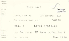 Tickets for this gig sold quickly; Nick Cave has a very committed hard core following. This is the only time I’ve seen him in concert. I have vague memories of The Birthday Party supporting Bauhaus at Newcastle University in the early 80s, but can’t be certain I attended that gig. David and I went to the Sage gig, David being more familiar with Cave’s material than I was. This was a solo concert, with Nick on piano, and Bad Seeds Warren Ellis (violin), Martyn Casey (bass) and Jim Sclavunos (drums). It was one of the first gigs I attended at the Sage Gateshead, which had only been open for a couple of months. Nick’s songs are dark and intense, and the set drew songs from throughout his career, and a selection from the Abattoir Blues/The Lyre of Orpheus album, which had been released around that time. Nick is a pretty cool guy (great moustache) and had some interesting banter with the crowd between songs. An excellent gig by a unique guy. Laura is pretty jealous and has Nick Cave high on her lists of concert must-sees. I bought her a signed copy of his book “The Death of Bunny Munro” which takes pride of place in her flat, and I have promised to take her to see him next time he comes to the North of England. Setlist: West Country Girl; Abattoir Blues; Red Right Hand; Hallelujah; Cannibals Hymn; God Is In the House; The Ship Song; Babe You Turn Me On; Christina The Astonishing; Henry Lee; The Mercy Seat; Hiding All Away; Messiah Ward; Rock Of Gibralter; Jack The Ripper. Encore 1: The Lyre Of Orpheus; Lucy; Stagger Lee. Encore 2: The Singer