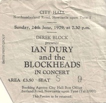 I first saw Ian Dury in Kilburn and the Highroads when they supported The Who at Newcastle Odeon on their 1973 Quadrophenia tour. I can’t pretend to remember much about them, other than they seemed like an ok pub rock band. Interesting to see that the Kilburns also featured Nick Cash who I was to see a few years later in 999, and who were truly a top punk band. The next time I saw Ian Dury was on the Stiff tour at Middlesbrough Town Hall, where he stole the show which closed with everyone on stage and all of us singing along to Sex and Drugs and Rock n Roll. Ian was an enigma on stage. He was, of course, nothing like a traditional rock star. And he was hardy “punk”. But his onstage patter, his humility, the way that he dealt with his disability, and his crazy dress sense, all gave him a charisma and a connection with the audience that no one else had in the day. We were all with him from the word go, and his stage presence, coupled with the tremendous musicianship of the Blockheads made every Dury gig a unique and fun experience. The thing that I remember most about the 1978 gig at Newcastle City Hall was that I had one of my final Maths exams for my degree the next morning. I figured that there was no point in any further revision at that point, so went along to see Ian and the Blockheads. Glad I made that choice! Support at that gig were Matumbi (a reggae band) and Whirlwind (a rockabilly band). For me, the best tracks live were Sweet Gene Vincent, Clever Trevor and Sex and Drugs. To be honest, I was never a great fan of Rhythm Stick or Reasons to be Cheerful, although I have warmed to the latter song recently. A setlist from Hammersmith in 1979 shows the songs played as: Clever Trevor; Inbetweenies; Don’t Ask Me; Reasons To Be Cheerful, Part 3; Sink My Boats; Waiting For Your Taxi; This Is What We Find; Mischief; What A Waste!; Hit Me With Your Rhythm Stick; Sweet Gene Vincent. I guess the Newcastle gig will have featured a similar set. I’m surprised Sex and Drugs and Rock n Roll doesn’t feature in the list. It was certainly a high point of the early Blockheads gigs I saw. Great memories of a one-off and a great man; sadly missed. Great gigs. Respect.