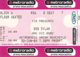 I’ve got a couple more Dylan concerts to cover after this, and then I will have blogged on all of my Dylan concert experiences. I figured Dylan is of such legendary stature that I really need to say something about each time I have experienced him in concert, but to be honest I’m finding it difficult, as the concerts have started to blend together in my memory. This is particularly true of the Newcastle Arena gigs, as I’ve seen Bob 5 time at that venue. Anyway here goes: Dylan was back at Newcastle Arena in 2004. David and I had good seats, in the second row, but a little too much to the side.
