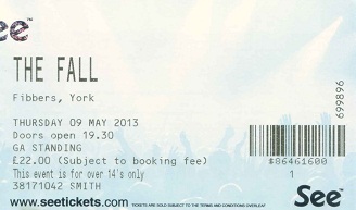 Laura and I went to see The Fall last night at Fibbers in York. We had promised each other that we would attend a Fall gig as soon as the opportunity came, having missed the last couple of times they came to the north east. Laura was intrigued to see them because of their legendary status and because many of her friends are big fans, and for me it was a chance to catch up on a band that I hadn’t seen for 33 (!) years. I have to admit never quite getting The Fall. The only other time I saw them was at a gig at the Newcastle Tyne Theatre in 1980. So I felt it was definitely time to put that right. We arrived at Fibbers around 8pm as people were just starting to wander in. The support band …And The Hangnails are a local Yorkshire punk/blues outfit and warmed up the crowd well. They played a short set, starting at around 9pm. The Fall took to the stage around 10pm. I’d read some stories of Mark E Smith leaving the stage and singing some of the set from the dressing room, and mixed reports of recent performances. Last night Mark seemed to me to be on pretty good form. He snarled the vocals, and they were pretty incomprehensible at times, which I guess is par for the course. He seemed in quite a good mood, although he did leave the stage several times, returning pretty quickly on each occasion. The band all left after 7 or 8 songs, and we thought that they were not going to return, but they were soon back to play several encores. I can’t pretend to know their material but did recognise White Lightning, which the crowd all sang along to, and for which Mark was accompanied by another singer. Recent single Bury also went down well with Mark snarling and spitting out the words. Its always difficult to fully enjoy a gig when you aren’t familiar with the material, but I reckon that last night was a pretty good showing by The Fall. The crowd certainly seemed to enjoy it, and gave the band a good reception. I know that The Fall have some of the most committed fans of any band, and many will have travelled from far afield for last night’s gig. They won’t have been disappointed. I hope that the guy I chatted to earlier in the evening enjoyed it. He’d come quite far and had been a bit disappointed by a recent Fall performance at Clitheroe. Laura and I left during the encores just before 11pm and suspect we may have missed a song or two (now there’s a reason for going to see The Fall again 🙂 ). Got home around 12.30am. I think I’m starting to get them, and thinking about it, would like to see them again next time they play close by, but I really must listen to their material (which may be difficult as I see that they have released around 30 albums!). Setlist (from the Fall fansite): Victrola; Strychnine; Hot Cake; Chino; Sir William Wray; Hittite Man; Bury; Duped; Loadstones; Sparta; Kinder of Spines; Jetplane; Blindness. Not sure this is actually what was played. They certainly also played White Lightning and there may be a couple on that list that weren’t played.