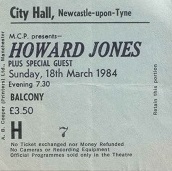 howardjonestix Howard Jones first single “New Song” was released in September 1983 and rose to No 3 in the UK charts. His second single “What is Love?” was released a couple of months later and made No 2 in the charts. In March 1984, Howard Jones’ released his fist album “Human’s Lib”, which was a massive success in the UK, Japan and the USA. The album entered the UK album chart at the No. 1 spot, spending a total of 57 weeks in the chart, and reaching double platinum status. howardjonesprog So Howard Jones was pretty big news when he toured the UK in March 1984 in support of the “Human’s Lib” album. “New Song” and “What is Love” are joyful songs, and Howard in concert was an enjoyable electropop experience. I read a review of a concert on the tour which mentions a revolving stage; which I don’t recall. Support for the tour was Scottish band Endgames. Howard’s single “Like to Get to Know You Well” was also a big hit later in 1984. I saw Howard Jones live once more, at Live Aid at Wembley Stadium in 1985, where he played “Hide and Seek”. He is touring quite regularly again at the moment.