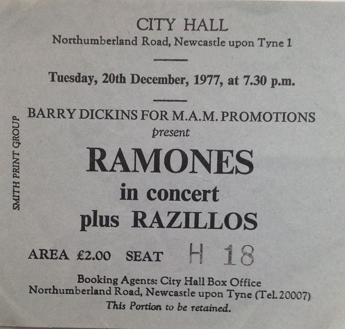 So on 20th December 1977, the North East finally got to see the Ramones. We’d heard “Sheena is a Punk Rocker” and all sung along to “Blitzkrieg Bop”, and we’d read so much about this band. Now we finally got the chance to see them. The City Hall was packed. It seemed everyone in the region who was into punk rock was there, including several who had already formed bands, and many others who were no doubt inspired to go and do so. Support came from Scotland’s The Rezillos (note spelling error on the ticket) who blended an image lifted from 60s Scifi B movies with frantic and fast surf rock, and featured lively singer Fay Fife. This was before they hit the charts with “Top of the Pops”. ramonesprogThey put on a suitably crazy and fun performance and warmed the crowd up admirably for the arrival of our comic book heroes. I’d gone along with a group of mates, and we had seats pretty near the front, with a clear view of all the action. The Ramones lived up to everything we had read and heard. They must have played at least 25 songs and yet they were probably on stage for less than one hour. The pace was fast and furious; 1. 2. 3. 4. and straight into the next song, each one a minor classic of teenage rock’n’roll angst. Joey held high a sign proclaiming “Gabba Gabba Hey” (I still don’t understand what the hell that means). Johnny frantically, yet effortlessly, buzzed those furious rock’roll chords out of his guitar, which was placed elegantly down on his knee. It was like nothing else I have seen before or since. These guys had speed down to a craft; it was almost as if they were willing themselves to play each song faster than the one before. By the time of this concert the Ramones had released three albums, and the tour was to promote their “Rocket to Russia” lp. The four brothers looked so cool in their denims and Lewis Leathers jackets (I always wanted a Lewis Leathers jacket; I had a cheap copy at the time but it just wasn’t the same 😦 ). From the Lewis Leathers website: “..in the ‘70s when the Ramones were wearing their leather jackets, the English Punks wanted to do the same, including the bands. The Clash went there, Brian James, Rat Scabies of The Damned, Steve Jones. Sid Vicious had an old Dominator jacket that he got off Viv Albertine of The Slits. The leather jacket was something to be seen in.” The set consisted of tracks from all three of their albums. Before we knew it..Phew..it was all over far too soon, and we were left to reflect on what we had just witnessed, and for many to go back home and try to play as fast as those guys.