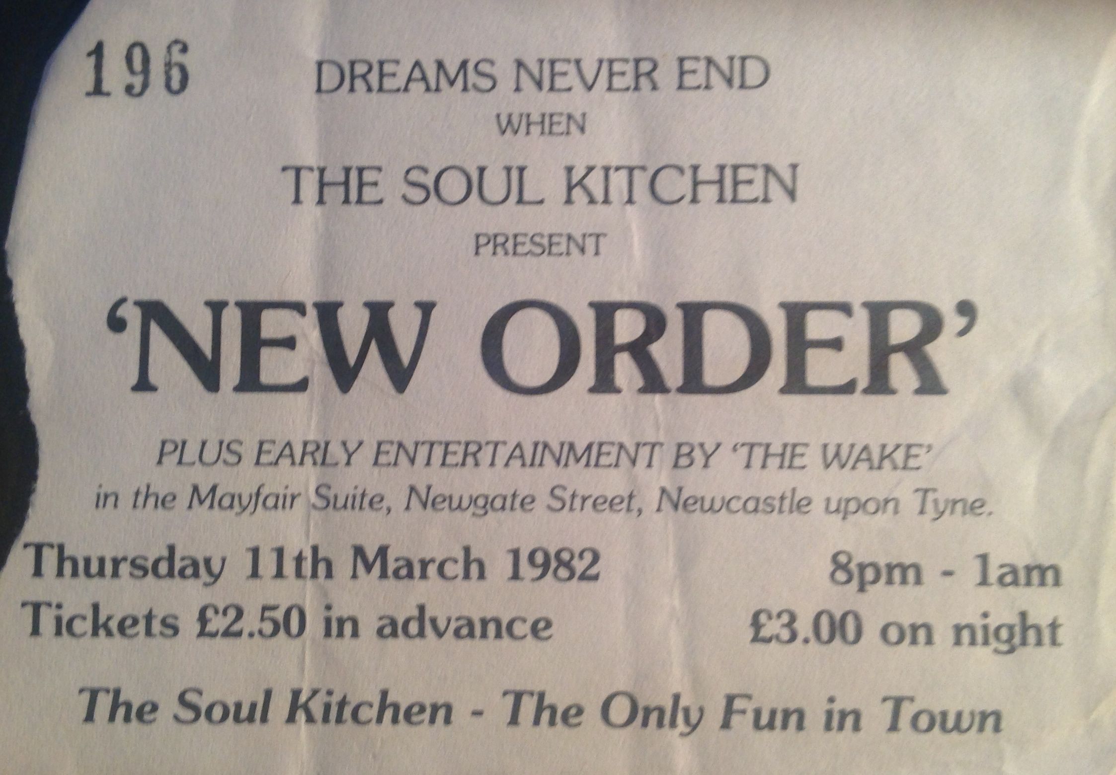 A year later local promoters The Soul Kitchen (“The Only Fun In Town” π ) booked New Order (“Dreams Never End”) for a concert at Newcastle Mayfair. By now they were playing several new songs which would appear on their 1983 second album “Power, Corruption & Lies”. The Mayfair was quite full, and I saw a big difference in New Order, compared to their performance at the Rock Garden. This was a much more confident band, more dance, more electronica. Blue Monday and massive success were yet to come, but you could sense that this was an important band. Bernard Sumner was much more of a front man, and Hookie’s bass was slipping further and further down to his knees; they were both forming their own rock star personas. Support (or “Early Entertainment” as the ticket says) came from Scottish band The Wake, who featured a young Bobby Gillespie.