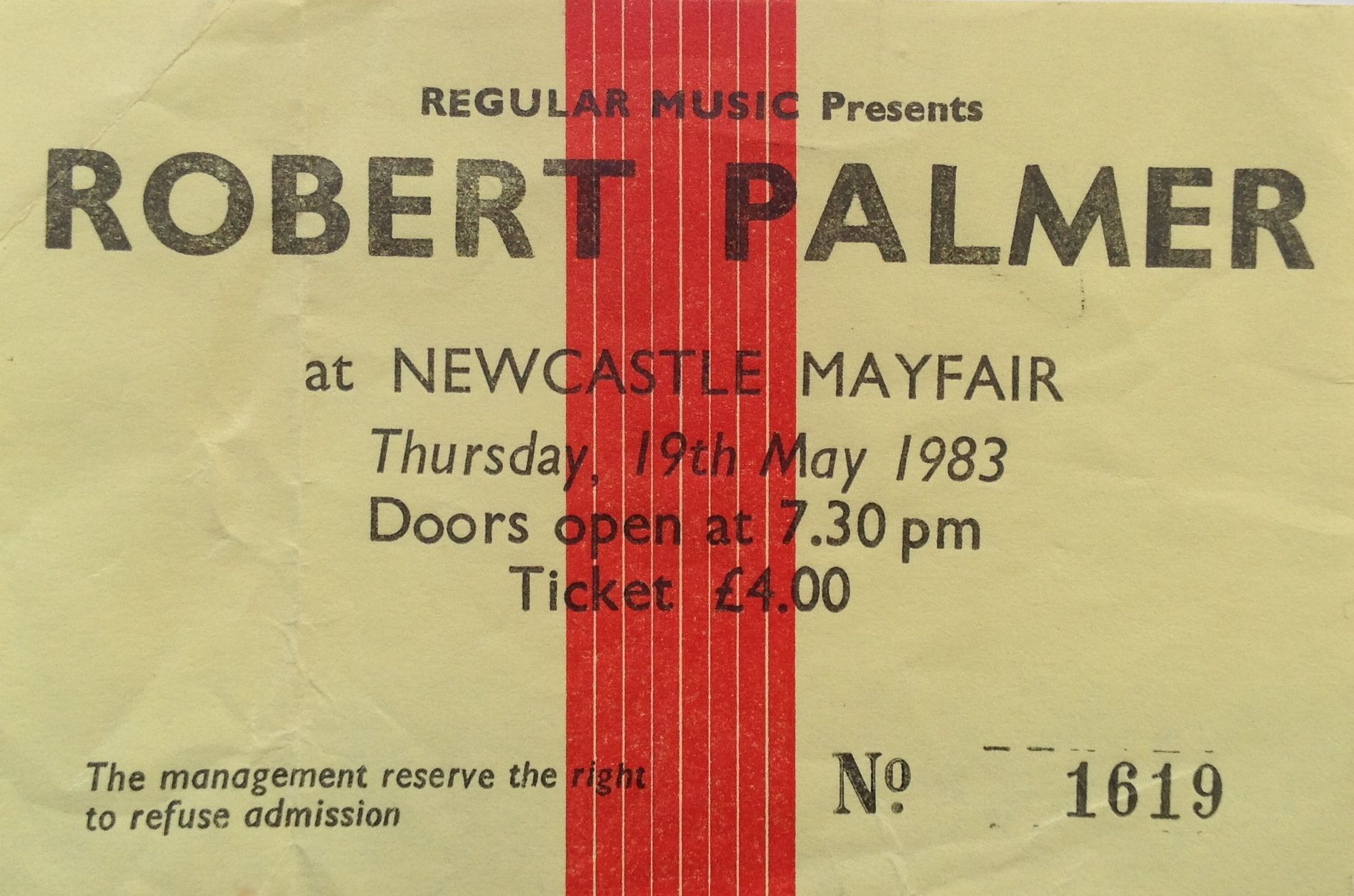 palmerRobert Palmer was a cool guy and a great R&B and soul singer. I first came across him when I saw him in Dada, a jazz/rock fusion band, who supported Iron Butterfly on their 1971 UK tour. Dada also featured Elkie Brooks, and the pair of singers were soon to form the great Vinegar Joe, who I was lucky enough to see several times in the early 70s. Palmer and Brooks were great together live; the cool, suave Yorkshireman was the perfect complement to Brooks’ fiery, wild and raucous stage persona. After Vinegar Joe folded, Palmer went on to forge a solo career, achieving particular success in the USA. By the time I saw him again at this gig at Newcastle Mayfair in 1983, he had released 7 albums. The tour was to promote the Pride album, and followed his success in the UK singles chart with Some Guys Have All The Luck which reached No 16, and was his biggest hit to date. palmertixThe show saw Palmer looking particularly cool in a snappy suit, and singing his blue-eyed soul to an appreciative Newcastle crowd. A live recording exists of the Hammersmith Palais show of the 1983 tour which shows the setlist as: Every Kinda People; What Can You Bring?; Dance For Me; Want You More; You Can Have It (Take My Heart); Woke Up Laughing; Say You Will; Sneakin’ Sally Through The Alley; Pride; It’s Not Difficult; Some Guys Have All The Luck; Best Of Both Worlds; Sulky Girl; Looking For Clues; Johnny And Mary. I would imagine that the set at the Mayfair will have been similar. Palmer went on to even bigger success a few years later with Addicted To Love (and that iconic video) and She Makes My Day. He died of a heart attack in a Paris hotel room on 26 September 2003 at the age of 54.
