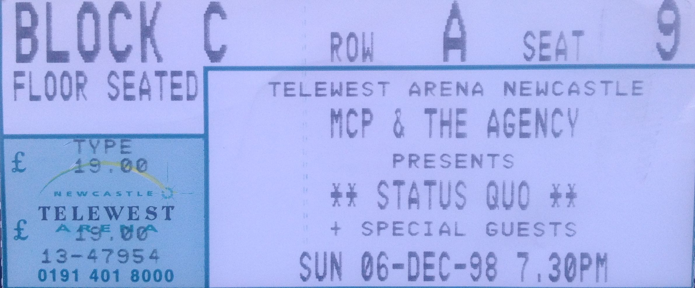 It had been five or more years since I had last seen the mighty Status Quo. I has lost some of my faith in the band, largely as a result of some substandard releases, which saw the band recording covers of some old rock’n’roll classics. But I couldn’t go on too long without seeing the band. So when I saw that they were playing Newcastle Arena on 6th December 1998, I persuaded a mate to come along with me to see them again. Support came from T’Pau. As soon as I heard the first few bars of “Down, Down” I was back in the Quo zone again. I remembered how great this band were, and why I had been to see them so many times.