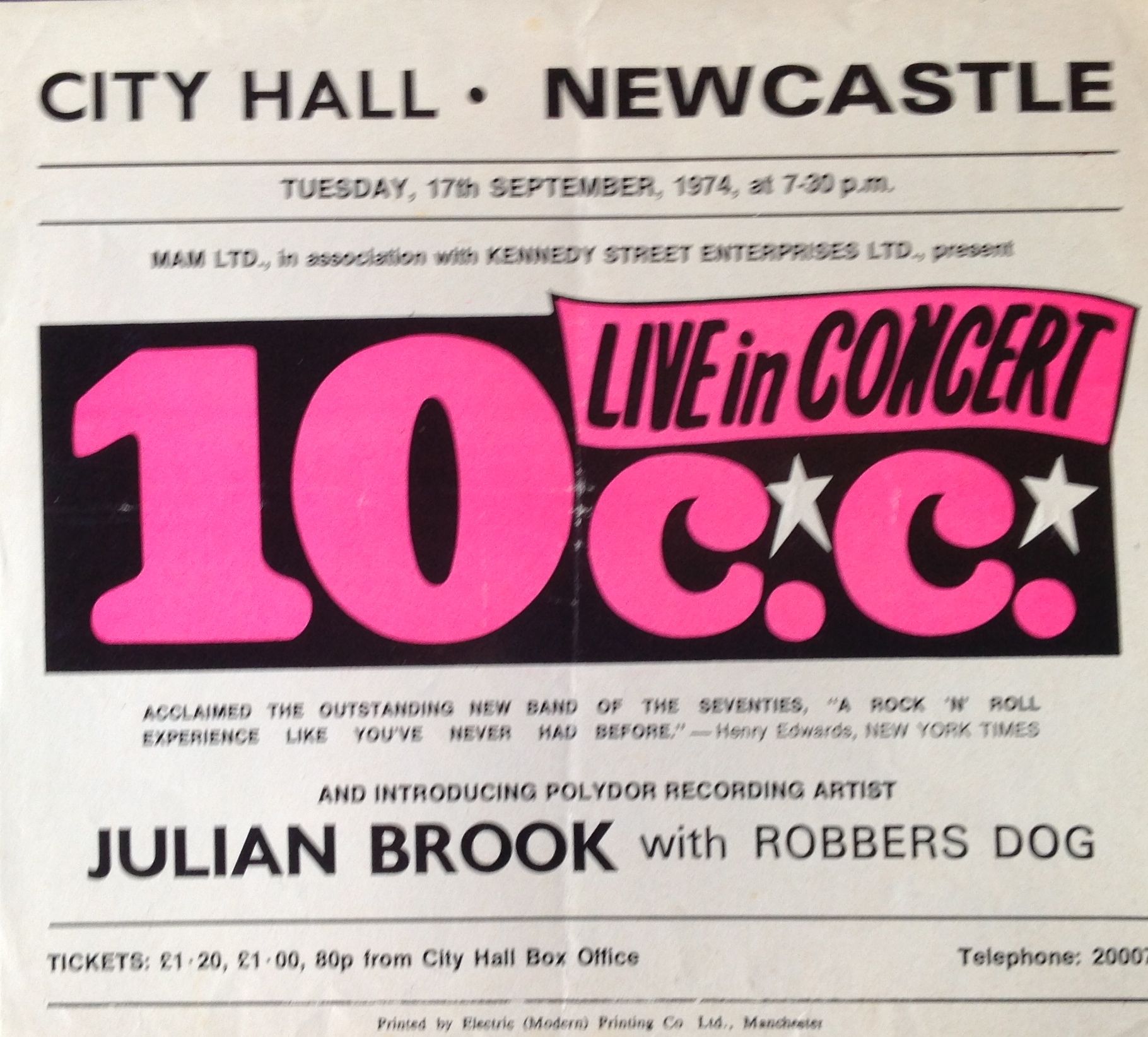 A month or so later I saw 10cc at the City Hall, which was another great gig. Support came from Julian Brook who had released an album “Portrait”. (Note. Who on earth were Robbers Dog, as mentioned on the flyer? π )