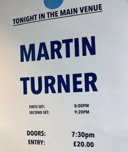 Jan, my carer for the evening, and I were led through a little hatch into the auditorium which holds 300 people and was pretty full. At 8 PM sharp, Martin Turner and his band took the stage. We were immediately transported back to the 1970s and the classic Argos album with “The King Will Come” (one of my favourites), followed by some later Wishbone Ash favourites as featured on the Live Dates 2 album including several I recognised immediately: “Lady Jay”; “F.U.B.B” (Fu**ed up Beyond Belief); “Persephone” and “Way Of The World”.