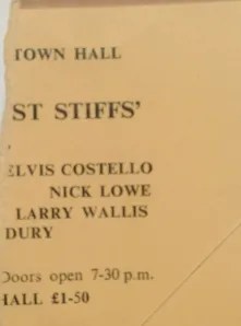 Now, the Stiff tours were a highlight of the late 70s rock calendar. These amazing events featured a selection of artists from Stiff records, travelling up and down the UK dropping into concert halls, university student unions and your local theatre. The first tour was known as the Live Stiffs Tour or 5 Live Stiffs and took place in late 1977. This first extravaganza boasted a stellar line-up of the new wave aristocracy with a young Elvis Costello with his fine Attractions, Ian Dury, and the magnificent Blockheads, the crazy, wild and 100% authentic Wreckless Eric, The Jesus of Cool Nick Lowe (featuring rocker supremo Dave Edmunds) and ex-Pink Fairies, Motorhead (and great Lewis leather jacket) Larry Wallis. The tour called at Newcastle Polytechnic a couple of weeks later. I enjoyed the show so much, I went along again, this time with Marie.