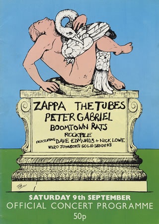 Next to a very different festival/concert: “Oh God, Not Another Boring Old Knebworth,” said the posters. Line-up: The Tubes, Frank Zappa, Peter Gabriel, Boomtown Rats, Rockpile, Wilko Johnson’s Solid Senders. This was the second Knebworth festival to take place in 1978, following the Genesis / Jefferson Starship / Tom Petty gig earlier in the summer. I remember thinking it was a bit late in the year for an open-air gig and feared the worst from the weather, but actually it was ok on the day; quite fine.