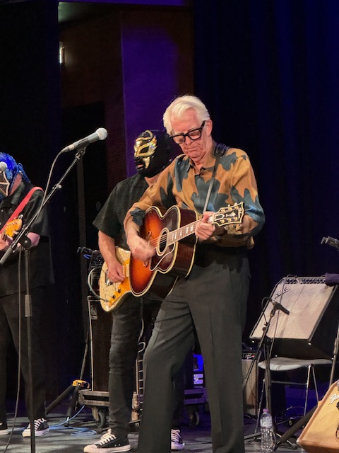 So, Nick Lowe and I go back a long way. He, his songs and his base and guitar playing were the foundation for many great bands throughout the years. It is a long time since I last saw Nick in concert. Many years have passed. I didn’t really know what to expect. The Fire Station website advertised the concert thus: “In September, Nick Lowe will release ‘Indoor Safari’ – his first full-length album in eleven years. Consisting of twelve songs, including brand new originals, a couple signature deep-cut covers, and refitted versions of tracks previously released in nascent form as singles, the album represents a culmination of Lowe’s decade-long working relationship with those mysterious masked men – Los Straitjackets (Eddie Angel/guitar; Pete Curry/bass; Chris Sprague/drums; Greg Townson/guitar).” And yes, the band did wear masks and were pretty weird to be honest.