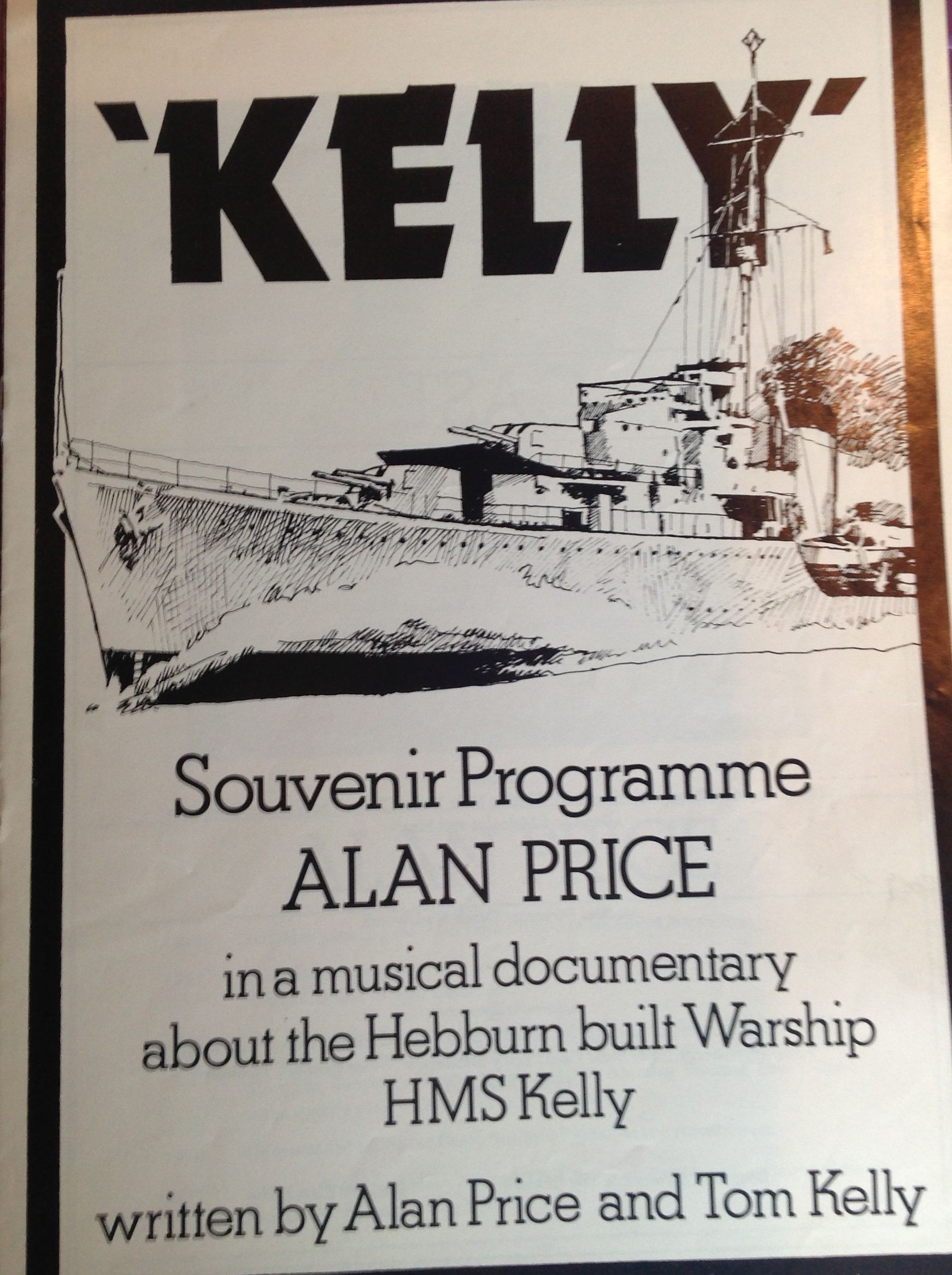 This was the first performance of “Kelly”, a musical play co-written by Alan Price and Tom Kelly in 1977. Kelly was based on the story of the Second World War warship HMS Kelly, which was sunk off the coast of Crete in 1941 while captained by The Queen’s cousin, Lord Louis Mountbatten. HMS Kelly was a destroyer of the British Royal Navy. She was built by Hawthorn Leslie and Company at Hebburn on the River Tyne in 1937, launched in 1938 and commissioned in 1939, just before the commencement of the war. She was named after Admiral of the Fleet Sir John Kelly.