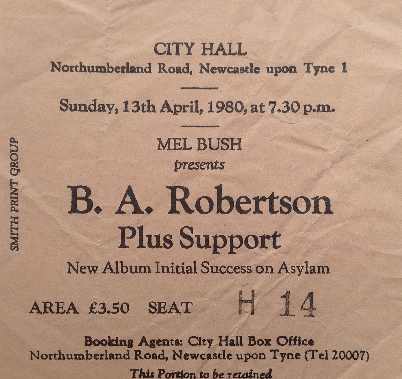 Not sure whether this is a guilty pleasure or not. I’d all but forgotten about this gig. One of the great things about writing this blog is that it reminds me of concerts that lie long forgotten somewhere in the depths of my fading memory. Another great thing is that it encourages me to read a bit about each act. Now all I remembered about B A Robertson until yesterday was the great fun single “Bang Bang”, which I though was pretty cool at the time; in a quirky sort of way. But a little googling and I find that he had a few more hits (including “Knocked it off” and the above mentioned “Kool in the Kaftan” which was out at the time of this concert; of course now I remember).