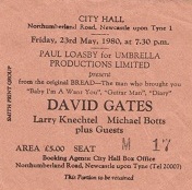 Bread have some pretty top songs. I remember being very excited about getting the chance to see them when they came to Newcastle City Hall in 1978. Marie and I went along and were just overwhelmed by those beautiful songs: “Make It with You”, “Everything I Own”, “Baby I’m-a Want You”, “If”, “Guitar Man”; each one a classic. The band were back again in 1980. Looking back at the tickets form those gigs tells its own story. The 1978 gig was billed as “David Gates and Bread”. However, by 1980 the ticket read: “David Gates, Larry Knechtel, Michael Botts and guests”.