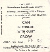 The songs were quite drawn out, some lasting up to 20 minutes. I enjoyed the gig, and am pleased that I went to see them. Support came from Crow, who became the Buster James Band a few years later, and are not to be confused with an American band of the same name. I got to see Can again a few years later, this time with a group of mates, at Redcar Coatham Bowl. That gig was in March 1977, I have a stub from a gig that year, but the name of the band has been torn off (which suggests it was a short name, like Can).