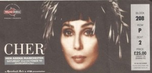 The gig itself was impressive; the set was a mix of songs from throughout her career, and featured a lot of costume changes. Cher was offstage for a couple of songs while she got changed, and a group of dancers took centre stage. At one point a nostalgic video sequence was shown with lots of clips of Cher, some with Sonny, from the 60s. Great stuff. It was an interesting concert, very much a show as much as a gig. Setlist: I Still Haven’t Found What I’m Looking For; All or Nothing; The Power; I Found Someone; We All Sleep Alone; The Way of Love; Half-Breed; Gypsys, Tramps & Thieves; Dark Lady; Take Me Home; After All; Walking in Memphis;Just Like Jesse James; The Shoop Shoop Song (It’s in His Kiss); Dov’è l’amore; Strong Enough;If I Could Turn Back Time. Encore: Believe