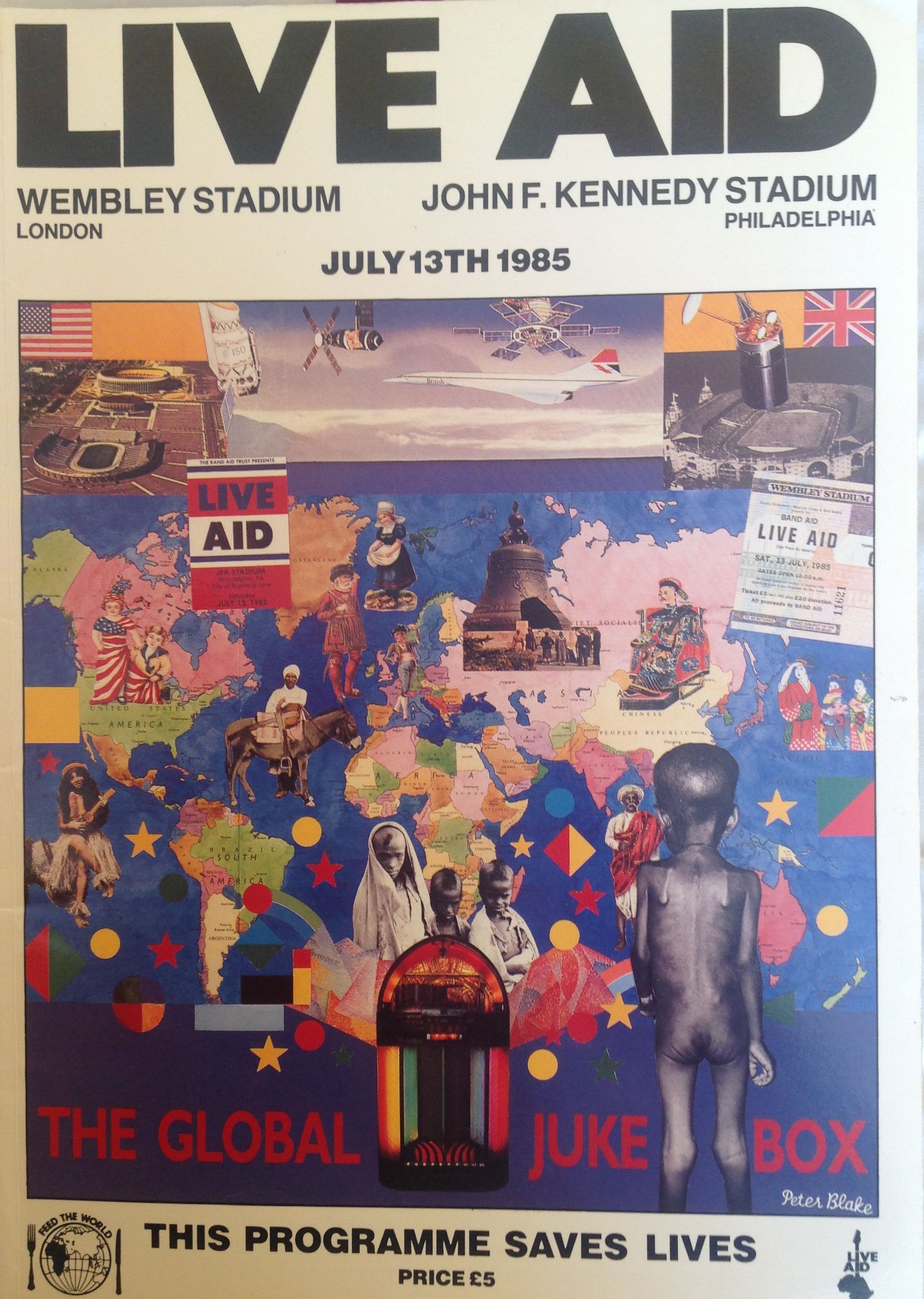 Line-up: Status Quo; The Style Council; The Boomtown Rats; Adam Ant; Ultravox; Spandau Ballet; Elvis Costello; Nik Kershaw; Sade; Sting; Phil Collins; Howard Jones; Bryan Ferry (with David Gilmour on guitar); Paul Young/Alison Moyet; U2; Dire Straits/Sting; Queen; Video “Dancing in the Streets” by David Bowie/Mick Jagger; David Bowie; The Who; Elton John (Kiki Dee and George Michael join Elton); Mercury and May; Paul McCartney; Finale