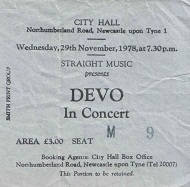 As the programme says: “The band eveolved from a long line of brain-eating apes, some of which settled in N.E. Ohio around Akron where members of Devo eventually appeared years after the A-Bomb ended World War II. By the process of natural selection they met and shared the habits of making electronic noise, watching TV and watching everybody esle. They called that they saw around them De-evolution and called their music Devo. It made the sound of things falling apart.” Support for the 1978 Newcastle gig came from The Members whose Sound of the Suburbs was pretty neat. They were fronted by singer Nicky Tesco who was a cool guy and good fun on stage.