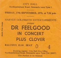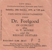 The Feelgoods visited the City Hall every year from 1976 to 1979 and I went each year. They were always a great live act, and I never saw them put on anything other than a great performance. They also had some pretty cool support acts: GT Moore and the Reggae Guitars on the 1975 tour, and the George Hatcher band in 1976 (although the ticket says Clover, I am pretty sure they were replaced on the tour by George Hatcher). I also saw them at the Reading Festival in 1975, where they were the favourites of the weekend. Went with a group of mates; I can remember all of us coming back from the local pub specially to catcg the Feelgood’s set.