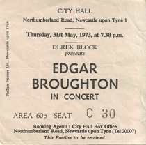 And indeed, he did. I was too young to make my way to Redcar at 14 and had no way to get there. I was there in spirit with you Edgar I told him. The police arrested Edgar and he spent the night in a police cell in the local jail. He wrote a song “Judge Called me a Liar” to commemorate the event. I related the whole story to Edgar. “Yes I remember that day well” and he smiled to me. I also told him how I had seen him many times over the years at Newcastle Mayfair, Sunderland Locarno several times, Newcastle City Hall, the Buxton Festival “It was very wet” Edgar said, and in later years at the City Hall as the Broughtons supporting (Ian) Gillan, in a club at Sheffield, Hull Adelphi club, York Duchess and more recently supporting Roger Chapman at Newcastle Academy. All great memories. Edgar nodded. We chatted on about old times. He kindly signed a CD for me. I moved over to let others talk to Edgar and soon it was time for him to take to the stage.