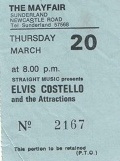 The Captain is holding court, telling tales of the Damned on the road and how his favourite band is ABBA. He demolishes a packet of crisps in one go including the plastic pack itself! Elvis is quiet, drinking his pint. I’m not sure why the Captain was there, as he wasn’t appearing that night; I guess he must just have come along for the ride. This was the second time I had seen Elvis Costello live and I must admit I was very impressed, particularly by his second single “Alison”. I had seen him a few weeks earlier at Middlesbrough Town Hall, again on the Stiff tour. I think it must have been around November 5th and Guy Fawkes night, as I recall we were waiting outside the venue and some young kids had their “guy” against the wall and asked Elvis “Penny for the Guy?” as he passed them on his way into the Town Hall. I think he threw them a few coppers. “That Elvis Costello” I told my mates. At the time I wondered how a young guy dared call himself “Elvis”. I was soon to find out. He was soon to be in the charts with “Watching the Detectives”. A few years later, in 1980, I saw him in my home town of Sunderland, at the Mayfair. I’ve seen him a few times before and after that over the years, but I must admit I still prefer those early, rocking, concert performances by an angry young Elvis who spat out the lyrics.