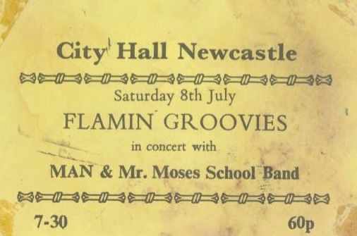 I first saw The Flamin’ Groovies at a concert at Newcasle City Hall in 1972. I keep all my ticket stubs, but don’t have one for this. I must have paid at the door, and not been given a ticket, which sometimes happened in those days. I know that tickets did exist for this gig, as I saw one for sale on eBay a few weeks ago; I bid on it, but sadly I was outbid at the last moment. I went along to the gig on my own, but ran into some friends from town, and joined them in seats near the front. The gig was general admission, with no seat numbers on the tickets, something which never seems to happen now. It was not well attended and there were plenty of empty seats. I went along partly out on curiosity; I had read some good reports of the Flamin’ Groovies from recent festival appearances, and also to see Man, who were one of the supporting acts. First up was a strange band called Mr Moses School Band. As I recall Mr Moses was the singer and he was totally outrageous, crazy and over the top.