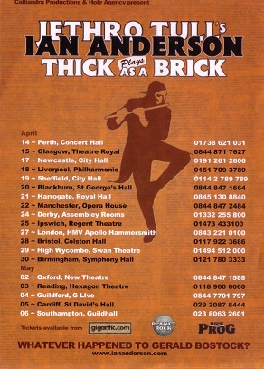 Ian has assembled an excellent band and the show is very theatrical with one guy playing the part of Gerald Bostock, and singing quite a lot of the vocals. The additional singer is a good move, giving Ian a break from singing at times. The show was supported by video and the use of props, and came over very well indeed. The situation around Ian Anderson and Jethro Tull is somewhat confusing to say the least. While it appears the Jethro Tull have not formally split, Ian Anderson is doing more and more things as solo projects, and Martin Barre has also started his own band, New Day, which will also feature Tull songs in their set. It also seems strange that Ian has chosen to revisit Thick as a Brick at this point, and that he is treating it as a solo project, when Martin Barre has been so intrinsic to the Tull sound for so long.