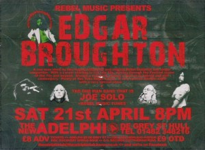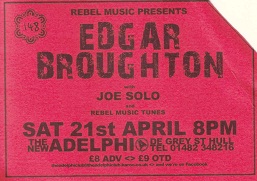 Out Demons Out! Norm and I went to see Edgar Broughton at the Adelphi Hull last night. Edgar is performing solo these days, just him singing his new songs with an acoustic guitar; the set consists largely of material that he has written over the past few years. We set off for Hull around 5.30pm and arrived around 7.45pm, after an uneventful drive via the York ring road, and found the Adelphi surprisingly easily. We popped into Wetherspoons for a bite to eat, and then went along to the venue around 8.45pm. The Adelphi is a great little venue which sits in De Grey street, just off one of the main routes through Hull. It has been running for many years, and has hosted gigs by some famous names such as Oasis, Pulp and Radiohead. It was the first time we had visited the venue and we were both pleasantly surprised. Support came from local, Scarborough-based, one man band Joe Solo, who gave us a set of folk protest songs, passionately delivered. For his last song he gave everyone in the audience a small percussion instrument and the whole room played along with him. Joe told us that it was 20 years since he first played The Adelphi.