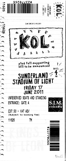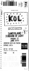 David and I went along to see Kings of Leon on Friday. We arrived in time to see White Lies who sounded OK; very Joy Division or Editors ish. KOL were very late in coming on stage (around 9.30pm); I think they were delayed in arriving. But that didn’t put a damper on it. From the word go they had the crowd singing along. Lots of stadium anthems. The Sunderland crowd loved them. But different to Take That!
