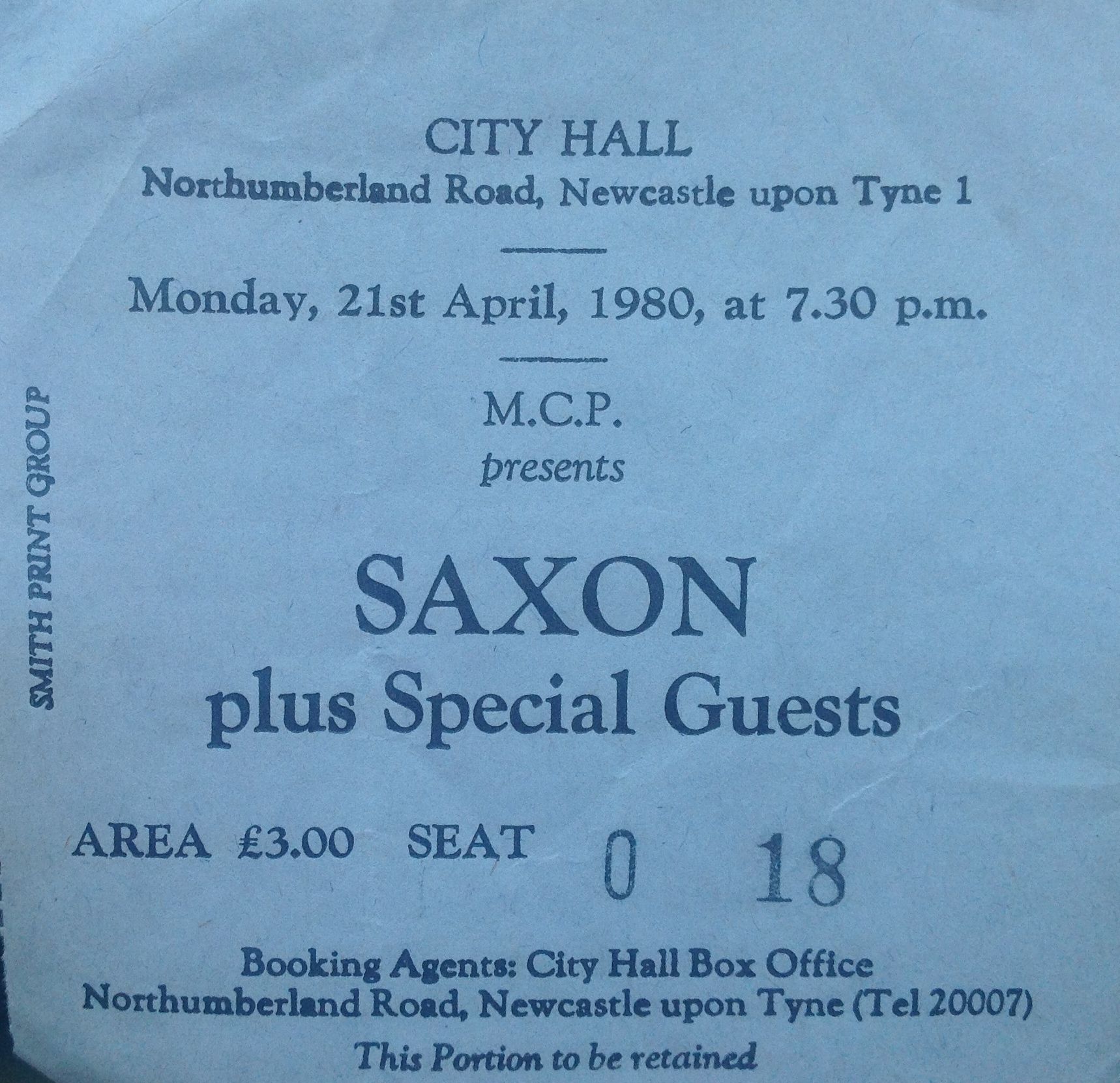 Saxon were, at the time: Biff Byford (vocals, big hair, leather jacket and lycra trousers); Graham Oliver (guitar); Paul Quinn (guitar); Steve Dawson (bass); and Pete Gill (drums). I remember one of the guitarists had his guitar attached to his belt buckle and would spin it around and around, which looked pretty impressive. Biff was the main man, however, and had good rapport with the North East crowds who warmed to his Yorkshire humour.