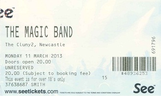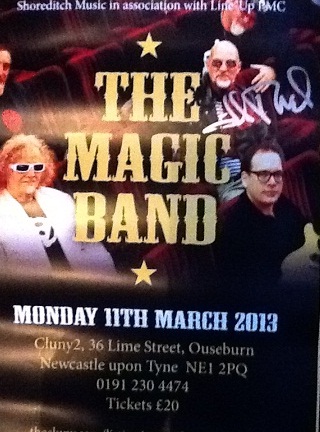 I went to see the reformed Magic Band last night at the Cluny. The Magic Band reformed in 2003, minus Captain Beefheart (who sadly passed away in 2010). The current line-up includes members John French (aka ‘Drumbo’, who first joined the band in the 60s) on lead vocals and mean harp playing, ‘Rockette Morton’ (who was also with the Captain in the late 60s and early 70s) on bass and Denny Walley (aka ‘Feelers Rebo’ who joined the band during the 70s) on guitar. These three old-timers are joined by Eric Klerks on guitar and Craig Bunch on drums. My first surprise was how packed the place was. The Cluny was full of 50 and 60 somethings, largely but not exclusively male, who knew every word and gave the band a great reception.