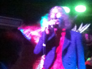 Laura had expressed interest in seeing veteran psych crazy guy Arthur Brown, so last night we took a trip to York to see our hero perform in all his splendour at Fibbers Club. The current Arthur Brown show returns to the “Crazy World of” moniker and concept, and thus focusses on his early material, drawing heavily from the 1968 album of the same name. Arthur has put together a band of young musicians who authentically replicate the 60s sound, with swirling keyboards reminiscent of the late great Vincent Crane (courtesy of Lucyy Rejchrtova), and lots of fuzz and wahwah guitar (from Nona Gromniak). Jim Mortimer is on bass, and was also introduced as the musical director of Arthur’s latest project, and on drums is Samuel Walker. Arthur was accompanied at the front of stage by dancer Angel Fallon, who wore a series of bright different costumes throughout the show. We arrived around 8pm and said hello to Charlie who was doing the sound. The set was a mix of covers (Kites, Green Manalishi) and tracks from the early days (Devils Grip, Spontaneous Apple Creation, I Put a Spell on You). Quite a few of the other songs in the set sounded familiar to me, but I’m not able to put a name to them. Arthur was as manic as ever and in good spirits, having a bit chat to us all, and indulging in some crazy, silly dancing. The new show is very theatrical and Arthur and the band have obviously put a lot into creating it. It features lots of costume changes, and great dance routines between Arthur and Angel. The band took to the stage wearing quite spooky bird masks with massive beaks, which set the tone for a quite dark night. The set ended with Fire with Arthur going mad, and Angel in a splendid costume with a massive silver cape and a large crown-like hat. Arthur’s voice is really strong, with screaming very much in evidence; not bad for a guy who entered his 7oth year in 2012. The encore was a super version of The Animals’ Don’t Let Me Be Misunderstood. The crowd loved it, as did Laura and I. Support act The Moulettes are worth a special mention. They were very different and quite unexpected, playing acoustic instruments: violin, cello, autoharp, bassoon; their music being a blend of folk and elizabethan. They reminded me a little of Blackmore’s night, and are certainly worth watching out for. Apologies for the grainy photo, I am really going to have to practice using my iphone camera.