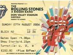 This was David’s first Stones experience. We had tickets on the pitch pretty near the stage. It was the second time I’d seen the Stones in Don Valley, and my 9th Stones concert experience. Support came from Paolo Nutini, who put in a respectable performance. He had just released the single New Shoes which I remember him singing. This was The Bigger Bang tout. I’d bought the new Bigger Bang album, and had played it a few times; there are a few OK tracks on the album, but overall nothing startling. The set up was as usual with am impressive stage set up and a B stage in the middle pitch. This time there was the added attraction for some, of being able to have a seat on the stage, looking down over the band.
