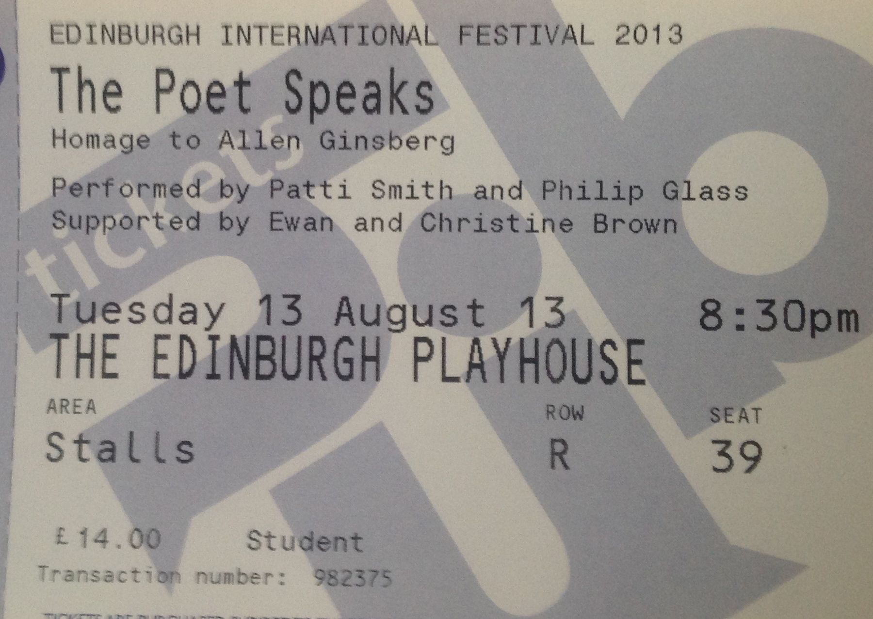 We were then treated to a video from a previous concert; of Philip Glass accompanying the legendary beat poet Allen Ginsberg. Stunning stuff, which brought back memories of when Laura, David, Shauna and I travelled to Edinburgh Playhouse and were lucky enough to see Patti Smith perform an evening of Allen Ginsberg poetry, again accompanied by Philip Glass on piano.