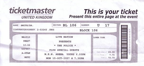 This show had been rescheduled from last October as Sting had been unwell at the time. I’d seen the Police many times in the late 70s and early 80s including the original band before Andy Summers joined when they supported (and backed I think) Cherry Vanilla at Middlesbrough Rock Garden and Newcastle Polytechnic. When I get the chance I’ll scan in the programmes and ticket stubs from shows that I have seen in the past including their Milton Keynes Bowl concert, Gateshead Stadium (with U2 support), redaing Festival headliner and shows at Newcastle City Hall and Mayfair.