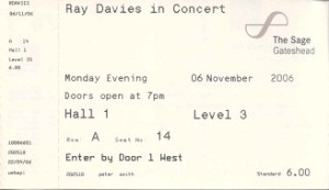 Went along to see Ray Davies, who was back at the Sage Gateshead last night. I arrive late, missing the support, and just before Ray took to the stage. The set contained a mix of well know Kinks classics, and some lesser know songs including Misfits, Muswell Hillbilly, Oklahoma USA and Full Moon, which were a change from Ray’s usual form and a nice surprise. The format of the show was similar to last time I saw Ray. He started with himself and a guitarist, bit on acoustic guitars, and then after several songs, his band joined him. All the well known songs were played: Where Have All The Good Times Gone; Dedicated Follower Of Fashion; Sunny Afternoon (which he told us he first performed in Sunderland!); See My Friends (still my favourite Kinks song); I’m Not Like Everybody Else; Autumn Almanac; Waterloo Sunset; Victoria; All Day & All Of The Night; Lola. Seeing Ray is always great. I’ve seen him quite a few times over recently, and still enjoyed it. In fact the change in setlist made last night even more enjoyable. But I still feel a little sadness that there is no sign of a Kinks reunion. Seeing Ray reminds me how great the Kinks were, and how wonderful it would be to see Dave and Mick up there beside him.