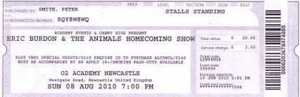 I was really looking forward to the gig; it had been around 20 years since I’d seen Burdon and I was very excited about seeing him again. I remember that I had an event to attend at work earlier in the evening, but managed to slip away in time to get through just as Burdon and the band took to the stage. Eric was on top form at this gig, and belted out the old hits. I’d almost forgotten just how hood he was, and was knocked out by his performance that night. The set was largely old classics from both versions of the Animals, including Its My Life, We Gotta Get Out of this Place, House of the Rising Sun, When I was Young, San Franciscan Nights, Sky Pilot, Don’t Let me be Misunderstood. A DVD called Yes you can go home includes some footage from the gig.