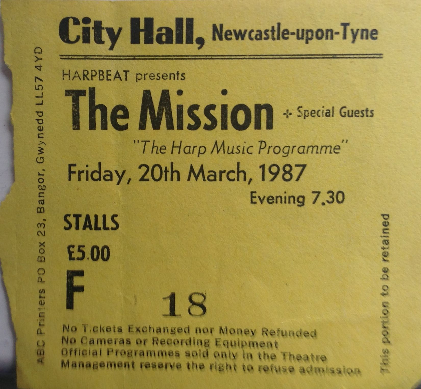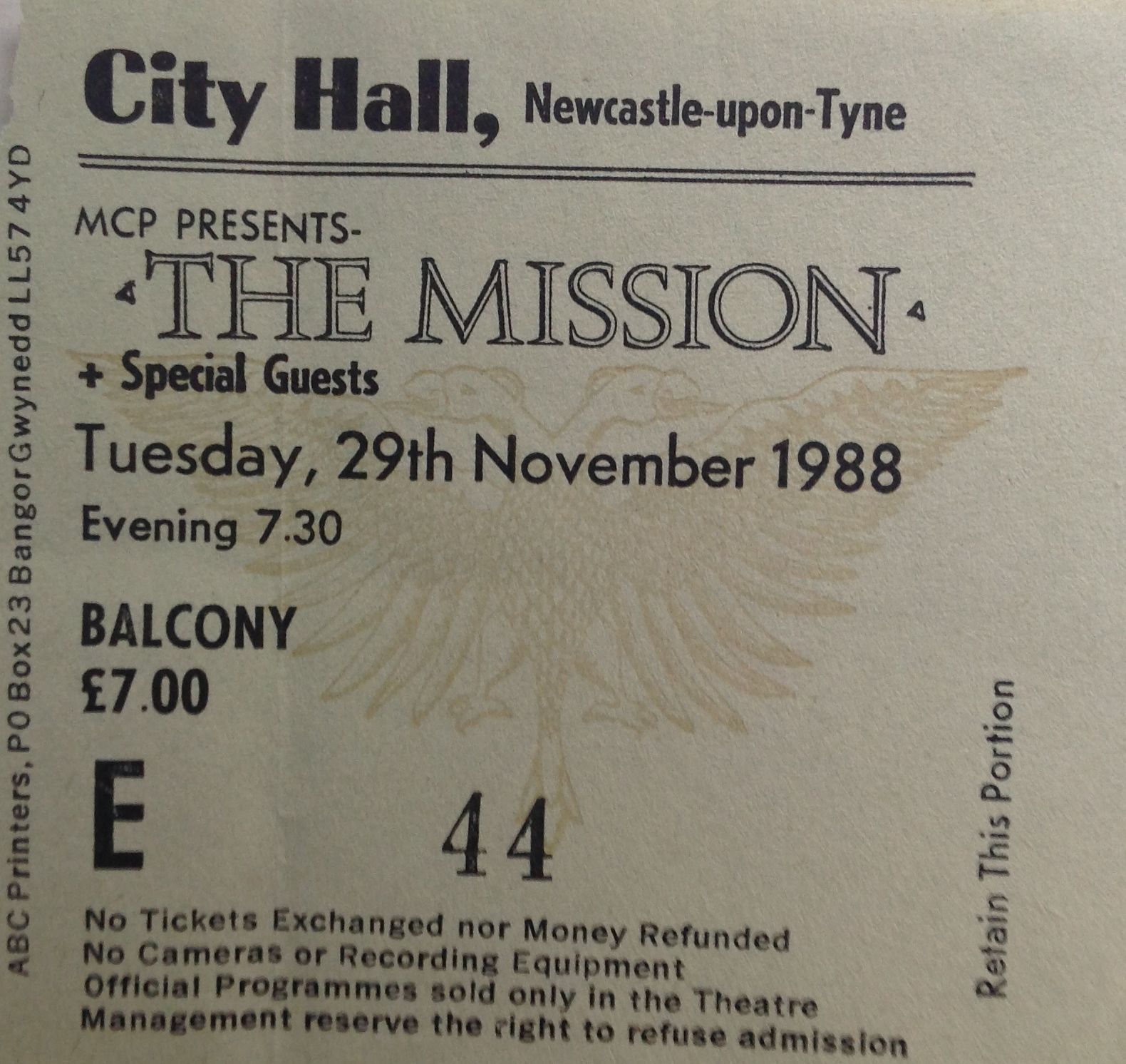 I saw the Mission on four occasions during ’87 and ’88; three times at Newcastle City Hall, and supporting U2 at Edinburgh Murrayfield Stadium (in August 1987). They were a mesmerising live act, whose set included dark, heavy rock, psych, and some great cover versions. The first time I saw them was 20th March 1987 at the City Hall. The support act was All About Eve, who were to go on to achieve success in their own right. They opened with a great heavy-psych version of The Beatles “Tomorrow Never Knows”, which set the mood for the rest of the gig. Their own material was all jangling guitars, swirling rhythms, and dark, deep goth vocals from front man Wayne Hussey. He formed the Mission after spells with Pauline Murray’s Invisible Girls, and the Sisters of Mercy.