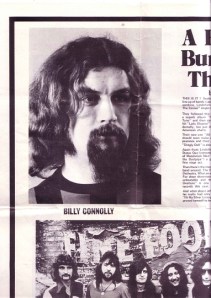 Grangemouth is north west of Edinburgh. The festival took place on Saturday 23 September 1972 and was part of the Grangemouth centenary celebrations. It was held in a sports stadium, which was in an industrial area, next to a gasworks, which spewed smoke over us at various times during the day. It wasn’t that well attended as I recall, with quite a heavy atmosphere, drunkenness, and some fights as the day went on. The promised line up was good, however a few of the bands who were billed did not play; a not uncommon occurrence in those days. Billy Connolly (see left from the programme of the festival) delivered a set pretty early during the day which was a mix of comedy and folk songs, and was one of the hits of the day for me. He’d just had a success at the Edinburgh festival and was just starting to make a name for himself.