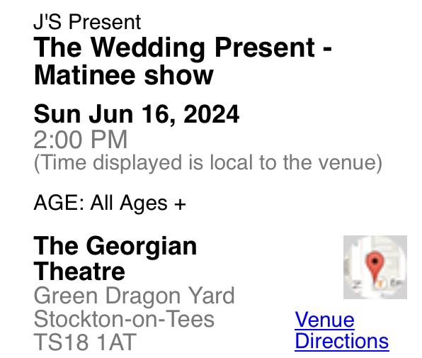 My blog friend Mark recommend I go and see The Wedding Present at Stockton Georgian Theatre as he was going to see them all three shows there. I could only manage to get tickets for the Sunday afternoon concert. The other shows were all fully subscribed. So, carer Chris, Norm and I turned up at 2 PM just-in-time to catch Cumbrian support act power pop-punk pair VOODOO RADIO consisting of singer/drummer Paige and her guitarist father Tony.