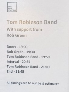 The Fire Station website stated: “A tour of songs from the albums POWER IN THE DARKNESS and TRB TWO. The first Tom Robinson Band emerged amid the turmoil of late 70s Britain – in a time of punk rock, political unrest, and economic gloom. TRB became known for the hit single 2-4-6-8 Motorway, their vocal support of Rock Against Racism and for the anthem Sing If You’re Glad To Be Gay, which made the Top Twenty despite a ban by BBC Radio 1.”