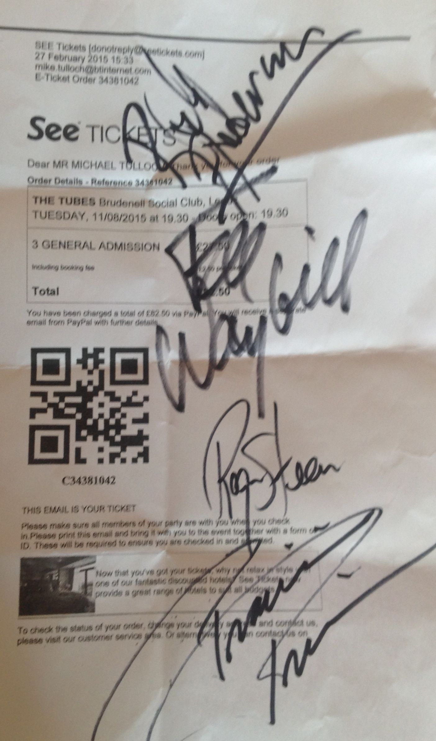 We arrived in Brudenell in plenty of time to sample a local hostelry just along the road from the Social Club. As we entered the bar, who should we spot but Tubes drummer Prairie Prince. Norm wandered over for a chat, and Prince kindly signed his ticket from the City Hall 1977 concert. Mick and I joined them. Mick, being a drummer himself, holds Prairie Prince in the highest regard, declaring him his favourite drummer.