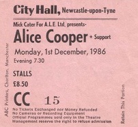 Alice was back in Newcastle two years later; this time for a two night stay at the City Hall. Support this time came from heavy metal act Chrome Molly, and Alice’s new album was Raise Your Fist and Yell. I found the following interesting snippet on the sickthingsuk site: “During the first night at Newcastle City Hall 8th April, 1988, Alice accidentally threw one of the dancers whips [during Go To Hell] up into the balcony and was caught, much to the delight of a female member of the audience (Steve Olley, January 2009).” The set was quite similar to Alice’s previous visit, and this time the show featured Freddie Kreuger appeared in the show!