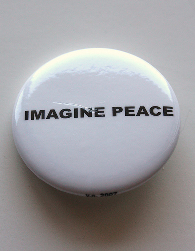Marie and I arrived in plenty of time for the event, and joined the queue to enter the performance space, which has a capacity of 116. It was clear from discussions in the queue that Yoko fans had travelled from all over the world for the chance to attend. We were each handed an “Imagine Peace” badge and a small Onochord torch as we entered. The white torch was marked “Onochord Liverpool y.o. 2008”. Marie and I sat in the front row and waited for Yoko to arrive. Soon she entered the room, and stood in front of a large screen showing footage of her 1967 Bluecoat performance where she requested the audience wrap her from head to foot in bandages. “I’m 75 and I’m alive and very thankful to be here every day, and to still be in love with life, and with you” she told us. Yoko then left the room for a short period and returned wrapped in bandages, picking up from where she left off in 1967. She sat in a chair and invited us to unwrap the bandages. A few of us did so; I still have the bandages that Marie and I removed from her legs 🙂