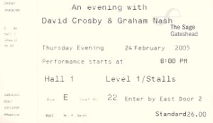 If you had asked me 10 years ago, I would have said that we wouldn’t see Crosby, Stills and Nash back in the UK. It seemed so long since they toured over here. I had my memories of the great CSNY gig at Wembley Stadium in 1974, and figured that would be the one and only time I saw that great band, or CSN, live in concert. However, I would have been wrong. The past 7 years has seen a few visits to the UK by Crosby and Nash, and CSN. The first news of this was that Crosby and Nash were to tour Europe in early 2005. The first concert to be announced was set for the Royal Festival Hall London in February 2005. I bought tickets straight away for Marie and I to go to that show; however within a week or so, a gig was added at The Sage Gateshead, a venue which is local to us. So I bought tickets for the Sage gig and sold our tickets for London (ebay comes in handy a lot these days). We had good seats for the Sage concert, and ran into lots of old friends there. The show started with Military Madness, and took us through all of those great songs, with those exquisite harmonies; as beautiful as ever. A month or so later, further UK dates were announced, this time with Stephen Stills as part of the line up. I couldn’t resist a chance to see CSN so bought tickets for the Manchester Arena concert. David came along with me and we both enjoyed it. These were two great gigs; these guys are responsible for some of the best music of the last 40 years. I’ve loved them since I heard Marrakesh Express on the radio in the late 60s.