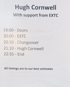 Hugh Cornwell Setlist: Coming Out of the Wilderness, Too Much Trash, Nice ‘n’ Sleazy, Wrong Side of the Tracks, Delightful Nightmare, Golden Brown, Totem and Taboo, Bad Vibrations, Dead Loss Angeles, Moments of Madness, When I Was a Young Man, Tank, Pure Evil, Mr. Leather, Nuclear Device, Another Kind of Love, Duchess, Live it and Breathe it, Wired, Big Bug, Mothra, Wrong Way Round.